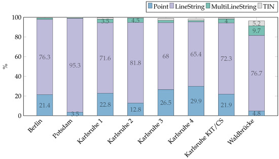 It can be seen that, for all data sets except Berlin, the vast majority of polygons are valid, i.e., are both planar and without self-intersections and if there exists an interior ring, its position and orientation are correct. In particular, they are topologically consistent. The values may differ from previous results given in [1] because this time all CityGML objects were imported into the databases instead of just importing the buildings.