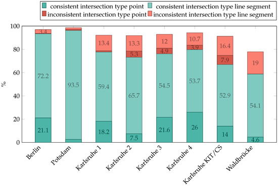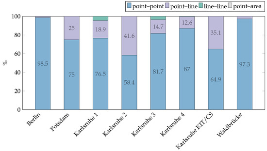 Figure 5 shows the percentages of polygon intersection types when the intersection is non-empty and the two polygons are distinct. A MultiLineString is a union of LineStrings with at least two components. TIN stands for Triangulated Irregular Network and means that the configuration is topologically inconsistent, as the intersection contains a surface strictly contained in the faces of both polygons. The other types may or may not be topologically consistent. It can be seen that the intersection is, in the vast majority of instances, either a point or a line segment. This is the reason why these two types of intersections were further investigated. In addition, the data sets from Karlsruhe have a high proportion of intersections of the type Point.