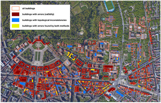 For the data sets “Berlin” and “Karlsruhe KIT/CS”, the inconsistent buildings found by our topological analysis and those found by val3dity (version 2.1.1) have been compared by their identifiers. Due to the differing definitions of error or inconsistency, the overlap is relatively small. In the “Berlin” data set, we have identified 6392 distinct buildings with inconsistencies in the database. For the analysis with val3dity, we have exported the whole database as one CityGML file. In addition, 723 inconsistent buildings have been identified by val3dity this way. Both sets of resulting building identifiers have an overlap of 113 identical building identifiers found by both methods. In the “Karlsruhe KIT/CS” data set, we found 497 inconsistent buildings, and val3dity found 319 with 78 buildings being in both sets (cf. Figure 8).
