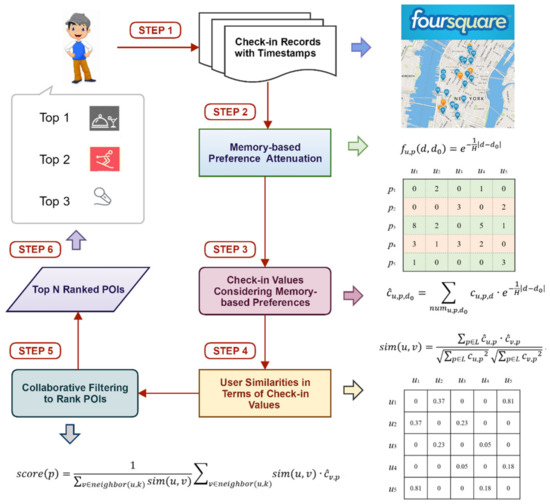 Flowchart of POI recommendation considering memory-based preference similarity.