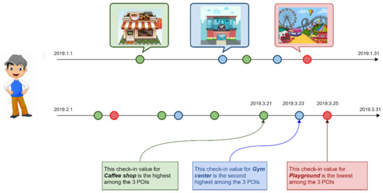 According to the literature, individuals’ POI preferences are also associated with temporal factors, which strongly influence most of the abovementioned contextual factors [19], as well as factors such as daily travel habits, lifestyle and characteristics of the current location and surrounding environment, which will gradually lead to changes in people’s POI preferences over time.