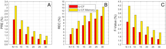 Here, the traditional user-based collaborative filtering recommendation algorithm is denoted by U-CF. Recommendation based on memory-based changes in user preference is denoted by U-CF-Memory. N values of 5, 10, 15, 20, 25 and 30 are considered.