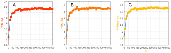 The REC metric exhibits a pattern similar to that of PRE. However, these two retrieval measures (i.e., the recall and precision) show different unimodal patterns, with a single peak occurring around the default value of H. Taking the recall as an example, at the default value of H, the REC value is 8.61%. As H decreases, the REC value initially decreases slowly, reaching 7.78% at H = 40. When H is less than 40, REC decreases at a much faster rate to 4.25% at H = 1. By contrast, as H increases towards large values, REC decreases at a slower rate, reaching 8.41% at H = 500.