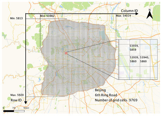 The study area was the district inside the sixth Ring Road of Beijing, as shown in Figure 2 (The algorithm to generating the grid and grid-cell-numbering schema is introduced in Section 3.1), which covers several large commuting areas, most bus stops, almost all metro stations, and all major transportation hubs.