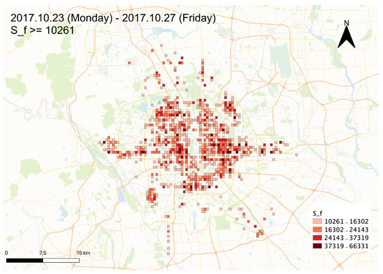 Because of the continuity of the grid cells’ spatial distribution, most cells have few or no user-transaction events. of the grid cells forms long-tailed distribution. It is not that meaningful to cluster those cells and try to find typical travel-demand patterns from them. A hierarchical clustering strategy is applied to detect potential clusters from the travel-demand sequence dataset. The travel-demand sequences are first clustered based on the scale of cycle flow (i.e., ) using the Jenks natural-breaks [21] classification method. With the 9769 samples, the seven detected classes are shown in Table 2. The distribution of the 919 grid cells with relatively large values (, the 4/5/6/7th bins in Table 2) are shown in Figure 4 as a value-by-alpha map [22]. The following clustering methods were applied to the 919 sample subset.