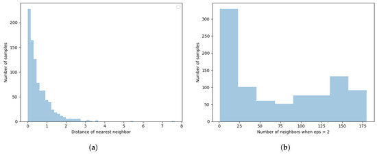 The DBSCAN algorithm requires two parameters, (1) epsilon(), which specifies the search radius in finding neighbors of points, and (2) MinPts, which determines how many neighbors a point should have to be considered as a core point. With the precomputed W-DTW distance matrix, we calculate the distance to the nearest neighbors of each point. The result is shown in Figure 6a. The result indicates that most points lie within 2.0 units from their nearest neighbors, so 2.0 is a reasonable guess for parameter .