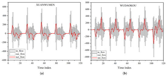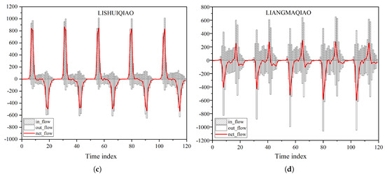 Grid cells in Cluster 1 shown in Figure 7a had large inflow in the morning rush hour (7:00–9:00), and massive outflow in the evening rush hour (17:00–20:00). This pattern usually exists near subway stations in a city’s residential areas. Most commuters rent bikes to transfer to urban rail transit. The scales of net flow during the morning and evening rush hours are similar, which means the sum of the net flow sequence throughout the day is relatively small. Thus the number of bikes remains relatively stable over a long period, without manual adjustment by the operator. However, since there are a large number of bikes flowing in the area in the morning that stay used until the evening rush hour, it can be considered a waste of resources. Contrary to the pattern in Cluster 1, demand patterns in Cluster 2, shown in Figure 7b, have massive outflow in the morning and large inflow in the evening. This flow pattern usually happens near business areas, as commuters use the shared bikes as a transition from subway systems to places of work. Similar to the pattern in Cluster 1, the number of bikes over days is balanced.