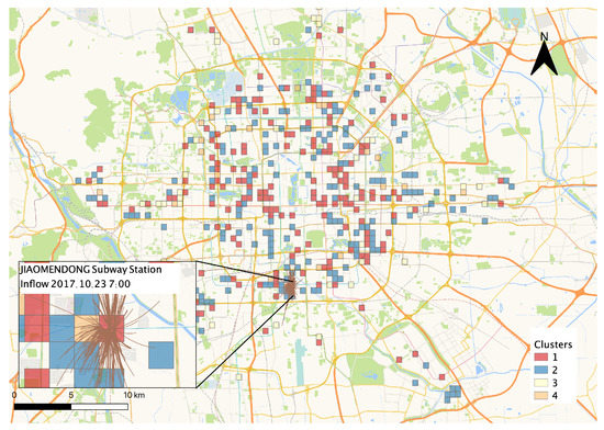 A previous study [18] classifies overdemand sequences of bike docks into several usage patterns, manually based on spatiotemporal demand analysis. The method for clustering travel-demand patterns proposed in this study can detect typical patterns automatically with time-series analysis techniques. We tried to cluster the travel-demand sequences using an unsupervised algorithm but to manually understand the cause of these travel-demand patterns. We plotted the inflows of specific cells in specific periods (as shown in Figure 8, bikes were concentrated in Jiaomendong subway station in morning rush hour). This plot can help to understand the source of bike accumulation, which is usually commuting-/transfer-travel demands. Motivation mechanisms like ‘bonus bikes’ can help reduce bike accumulation in some areas. For example, if a user rides in the opposite direction of the massive bike flow in the morning/evening rush hour, they can receive rewards after the ride. This method can encourage users to help redistribute bikes. But neither travel-demand analysis nor the bonus-bike mechanism is good enough to lead to a perfect bike-redistribution mechanism.