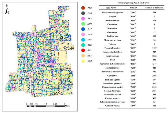 Illustration of study area (Xicheng District, Beijing) and the description of POI data. (Key to abbreviated names is in Table 1).