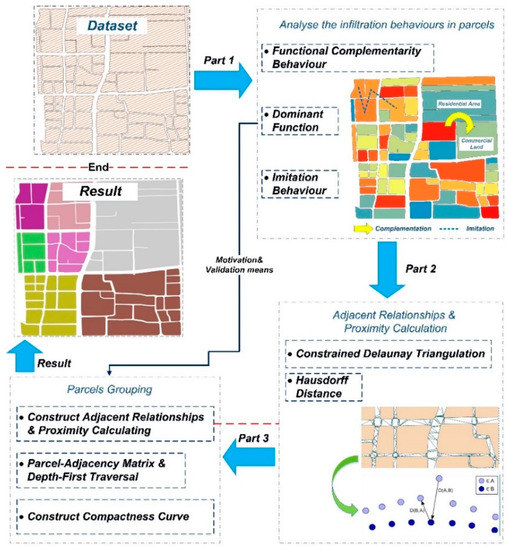 Our proposed method for processing an urban parcel grouping is composed of three parts (Figure 3). (1) An analysis of the infiltration behaviour of adjacent parcels (refer to Section 3.2). This study implemented three indicators to discover the infiltration behaviours of the components among parcels. (2) Construct the adjacent relationships among parcels and calculate the proximity between two adjacent parcels (refer to Section 3.3). (3) Urban parcel grouping method (refer to Section 3.4). The proposed urban parcel grouping method uses a graph algorithm to form parcel groups, and obtains the optimum grouping result by analysing the compactness among parcels.