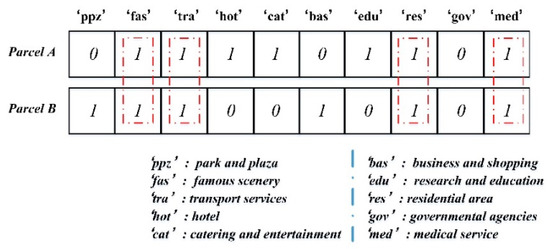 Imitation behaviour: This kind of behaviour describes the similarity of the components between adjacent parcels. When two parcels are adjacent and both parcels are composed of three parts—residential area, shopping centre, and catering service—then we conclude that there are imitation behaviours between two parcels. Thus, we can construct a vector to describe the composition of a parcel. Each attribute (dimension) in the vector corresponds to a land use type. The value of each attribute is 1 or 0, where “1” indicates that a certain land use type exists in the current parcel, and “0” indicates that it does not exist (Figure 4).