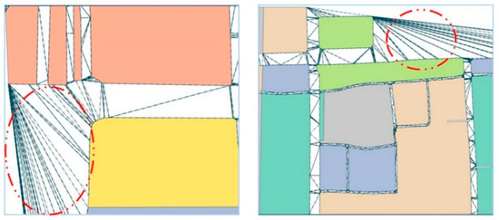 The relationship between two parcels was expressed by the graph-based method. First, we constructed the CDT for the parcels using a point-by-point insertion algorithm. Second, we classified triangles according to the parcel to which the triangle’s vertices belonged. The triangle, with vertices belonging to two different parcels, was named a connecting triangle. If two parcels were connected by connecting triangles, we named the two parcels conflicting parcels, which were evaluated based on the condition of ‘whether the three vertices of a triangle belong to the same polygon boundary’. When two parcels consisted of conflicting parcels, we considered them to have an adjacent relationship. The CDT was constructed for all parcels by analysing whether an adjacent relationship existed between any two parcels. Considering that a long and thin triangle easily produces an incorrect assessment of the adjacency relationship between two parcels (refer to Figure 5), it was necessary to eliminate the long and thin triangles in connecting triangles.