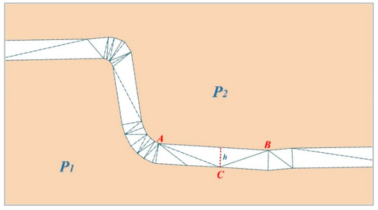 The triangles in the CDT connect parcels that are adjacent (refer to Figure 6). The adjacent relationship between P1 and P2 is obtained from the edges of the connecting triangles, such as triangle ABC (AB). The heights (h) of all connecting triangles between two adjacent parcels are calculated and used to calculate the proximity between two adjacent parcels.