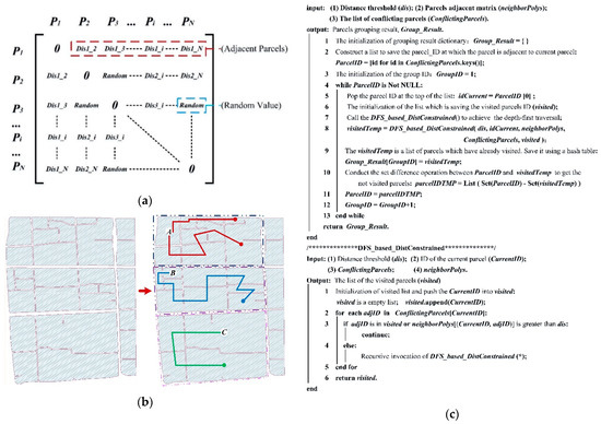The proposed algorithm for grouping parcels involved three main steps (refer to Figure 7c): (1) Extract the keys of a hash table, which stores conflicting parcels, and save these keys as a new list named ParcelID. (2) Iterate over the ParcelID. In the loop, we pop the value named idCurrent at the top of the ParcelID and then input the distance threshold, idCurrent, ParcelID, and the parcel’s adjacent matrix into the depth-first traversal function to obtain the visited list of parcels. (3) Add the visited list to a hash table named Group_Result and remove it from ParcelID, update the ParcelID and enter the next loop. The algorithm terminates when ParcelID is empty.