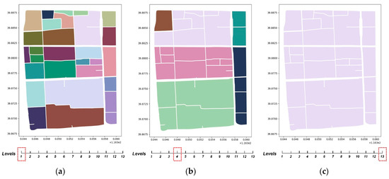 then Si+1 to Si+j belongs to the second level and Si+1+j belongs to the third level. By analogy, we obtained a hierarchical proximity sequence. The result of level-by-level tuning is illustrated in Figure 8. According to the results, we observed that the number of groups easily changed with the levels. For example, at level 1, each parcel constituted a group (see Figure 8a) or, at level 13, all parcels formed only one group (see Figure 8c). According to Gestalt theory, this was not a very good means of grouping, and could not effectively convey the compactness and proximity mutation. Therefore, an optimum number of groups should be set to make the grouping process more automated and obtain a reasonable grouping result.