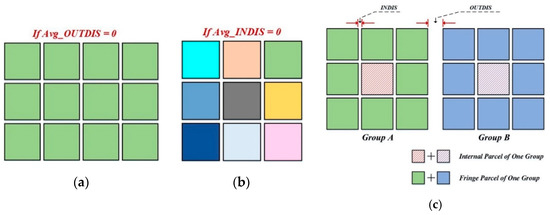 This definition indicates that the Compactness(i) is not consistent with the silhouette criterion. For Compactness(i) to be 1, we require that Avg_INDIS(i) to be 0. As Avg_INDIS(i) is a measure of how dissimilar i is to its cluster, a small value indicates that it is well matched. A large Avg_OUTDIS(i) implies that i is poorly matched to its neighbouring group. Thus, when the compactness is equal to 1, all parcels become separate groups (refer to Figure 8a and Figure 9b). If the compactness is equal to minus one when Avg_OUTDIS(i) is zero, then we observe that all parcels are aggregated into one group (refer to Figure 8c and Figure 9a). In addition to the two special cases, Avg_OUTDIS(i) is always greater than Avg_INDIS(i) according to their definitions (refer to Figure 9c). When a parcel is completely surrounded by other parcels in the same group, it is not directly adjacent to the parcels of other groups, its Avg_OUTDIS is replaced by the minimum OUTDIS of all other parcels within the same group. The average Compactness(i) for all parcels of a group is a measure of how tightly the parcels in the group are grouped. Thus, the average Compactness(i) for all data of the entire dataset is a measure of how appropriately the data have been grouped.
