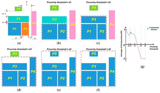 Illustration of grouping results with different proximity thresholds: (a) ungrouped parcels; (b) proximity threshold = d1; (c) proximity threshold = d2; (d) proximity threshold = d3; (e) proximity threshold = d4; (f) proximity threshold = d5; (g) the relationship between compactness and proximity threshold.