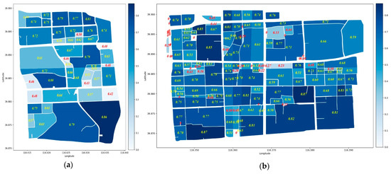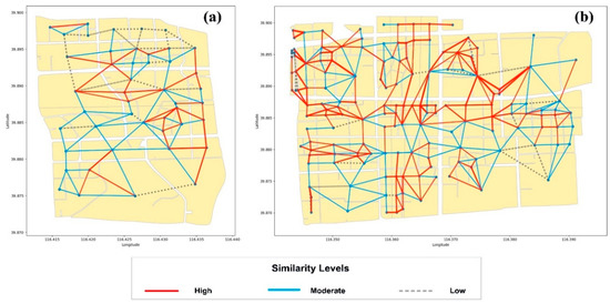 Compact distribution of parcels causes frequent interactions among the urban elements and population; this kind of interaction also causes infiltration of components without distinct boundaries [58]. The mutual infiltration forms the functional connectivity characteristics among parcels, which ensure the stability of shape and structure. This kind of infiltration behaviour consists of two main modes: (1) Functional complementarity among parcels, that is, the adjacent parcels form a multi-functional place, where a combination of functions (living, working, communicating, cultural and sporting activities) provide mutual support for various human activities. (2) Component imitation between adjacent parcels, that is, two adjacent parcels are similar in the combination of land use types. The imitation behaviour satisfies the description of Tobler’s first law, i.e., everything is related to everything else, but near things are more related than distant things. These two modes do not exist in isolation. When functional complementary behaviour frequently occurs between two parcels, the imitation behaviour will eventually occur due to long-term infiltration of components.