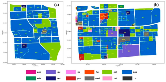 Since the 1980s, a large number of extensive single-purpose regions divided by functions (such as industrial areas, business area and residential areas, etc.) emerged in Chinese cities, which leads to the coarseness and simplicity of urban form. Existing research [26,27] has focused more on the origin–destination pattern on a vehicle scale, and has not considered the impact of physical form on spatial interactions. The concept of “regions” is gradually taking the place of “parcels”, manifesting the heterogeneity of inter-regions and the homogeneity within regions. Since modern planning methods overemphasise functional zoning and simplification of purpose, pursuing the rational spatial form and the unified visual spatial order diminishes urban vitality [28]. Small-scale and multi-factor mixing is the foundation of parcel diversification [29]. For a large area, parcel grouping and functional reorganisation can be performed on a small scale. This kind of grouping of parcels needs to consider the functional connectivity and infiltration of components among adjacent parcels. Mutual infiltration ensures complementary functions within a group and improves the stability of parcel morphology. Parcel grouping utilises function mixing as a design tool to further achieve user mixing, which creates a pluralistic city.