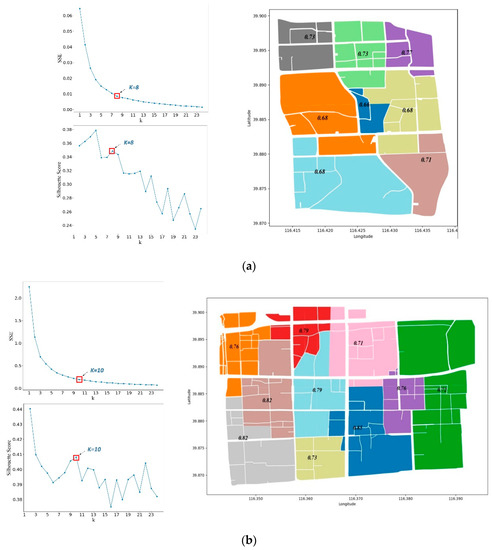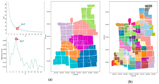 To understand how well the grouping result matches the urban land use, we measured the hard segmentation by the amount of overlapping that exists among the grouping results (refer to Figure 19c, Figure 21a,b) with Beijing’s Urban Master Plan (2016–2035) (http://ghzrzyw.beijing.gov.cn/art/2018/1/9/art_5096_544304.html). To ensure the validity of the contrast experiment, we performed the k-means++ method with two different settings of cluster number: (1) the optimised cluster number (k = 7) and (2) the same cluster number as group number of UPG (k = 51).
