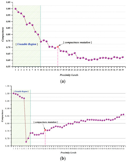 On the basis of Equation (10), we calculated Compactness(Pi) of each parcel (refer to Table 3) and drew the curve to describe the relationship between average of Compactness(Pi) and the proximity threshold (refer to Figure 10g). The curve exhibited a declining trend as a whole: (1) when the value of the curve was 1 or close to 1, the corresponding grouping result was ungrouped, that is, numerous parcels become separated groups; (2) when the value of the curve was −1, all parcels aggregate into one group. The curve has a mutation value, which corresponds to the grouping result, as illustrated in Figure 10c. Among all grouping results, Figure 10c showed that the intergroup distance was larger than the intragroup distance, which was consistent with the cognitive habit and satisfies the requirements of compactness and continuity in Gestalt theory. We determined that the reason for the mutation value was that Avg_OUTDIS(i) was larger than Avg_OUTDIS(i). Therefore, to obtain a reasonable parcel grouping result, we should determine the proximity threshold, which has a mutation value in the compactness curve. Through the analysis of Table 3, we also determined that the compactness of the internal parcel grouping increased gradually, as in P1. If the number of such parcels in the grouping result also increases gradually, then the value of the curve may increase.