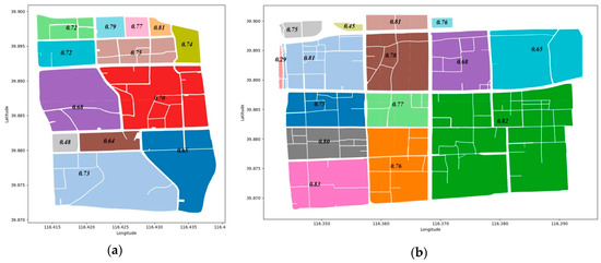 As we discussed previously, narrow roads are more suitable for residents to walk or bike, which not only improve the mobility of residents but also increase the frequency of parcel interaction. Thus, grouping results should ensure that the roads within the group are narrower and the roads between two groups are wider, which enable parcels of the intra-group to frequently interact and enhance the spatial correlation of parcels within the same group. According to ‘Technical code for urban road engineering (GB51286-2018)’, and combined with the Baidu Map for an approximate distance measurement, we calculated that the width of the road within the parcel group ranged from 8 m to 20 m, and the width range showed agreement with the width range of branch roads, i.e., the fourth-level roads in the road grade system. The branch road, which has traffic function and service function, primarily provides a suitable living space, parking space, and necessary public space. The grouping result is consistent with the original intention of our design.