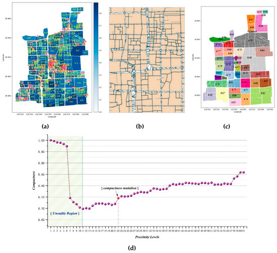 In Section 4.3, we further verified the validity of the proposed method using Xicheng District in Beijing. CDT was utilised to construct the spatial proximity relationships; the result is shown in Figure 19b. The compactness curve showed a variation value (refer to Figure 19d), which we referred to as a proximity mutation. As depicted in our algorithm, we used level 22, to which the proximity mutation corresponded, as the input value, and obtained the ideal grouping result (refer to Figure 19c), which consisted of 51 groups. Compared to the MLU index of each parcel before grouping (refer to Figure 19a), the MLU index after grouping increased by 1.68 on average, and the overall growth was 85.71, which indicated that the parcels obtained functional complementarity.