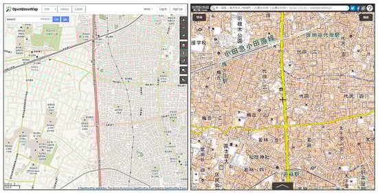 Excerpt of OSM [left] and Geospatial Information Authority of Japan (GSI) base map [right]. Note the inconsistency in completeness for OSM, in contrast to the GSI data.