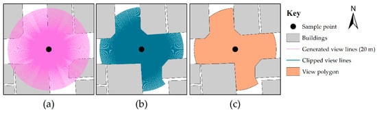 To model the behavior of the laser scanner and localization process, two auxiliary layers were produced: view lines and view polygons. Firstly, for each sample point, 360 view lines, each 20 m in length, radiating outwards from the center at 1° interval, were generated (Figure 3a). These lines represent the laser scanner’s 20 m range. Within the urban environment, the walls of buildings represent a ‘solid’ and opaque barrier for the laser scanner. As 2D GI was used, it is assumed that buildings are infinitely tall, and view lines were clipped where they intersect with the building layer (Figure 3b). This assumption was based on the 30° vertical field of view (+/− 15° up and down) of the Velodyne VLP-16. Mounted at 2.45 m, and with a laser range of 20 m, the effective vertical view is between 0 to 7.8 m. This is equivalent to an average two-story building. Considering the buildings in the experiment area were, at a minimum, three stories high, this assumption was acceptable. Secondly, from these clipped view lines, a minimum bounding convex hull was generated as an areal representation of what the laser scanner ‘sees’ and is referred to as a view polygon (Figure 3c).