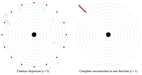 where α is the azimuth of the features, in radians. The factor returns a value between 0 and 1, with a value of 0 indicating a uniform dispersion and a value of 1 meaning a complete concentration in one direction (Figure 4). For this factor, the dispersion of the intersection points between the view lines or view polygons and the respective layer was calculated.