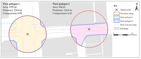To measure compactness, the ratio between the area of the view polygon and the area of a circle with the same radius was calculated. A low compactness could suggest that there are many buildings features nearby, providing plenty of stable features and building elements to localize against. Conversely, a high compactness could suggest that there are not many building features in the vicinity. In addition, due to the spread of the laser scanner, closer features are captured at a higher resolution than those which are further away. At longer distances, the laser scanner may not be able to capture the finer details of a building’s façade for localization. Figure 5 illustrates how area, perimeter and compactness can vary along the experiment path.