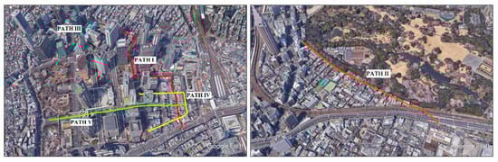 The study area is Shinjuku, Tokyo, Japan. The architecture is relatively heterogeneous, with buildings ranging from low-rise shops to multi-story structures. Similarly, roads vary from single narrow lanes to wide multi-lane carriageways. Five experiment paths were selected to represent a range of environmental configurations, as shown in Figure 6. Table 2 shows a summary and description of all the experiment paths.
