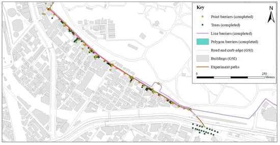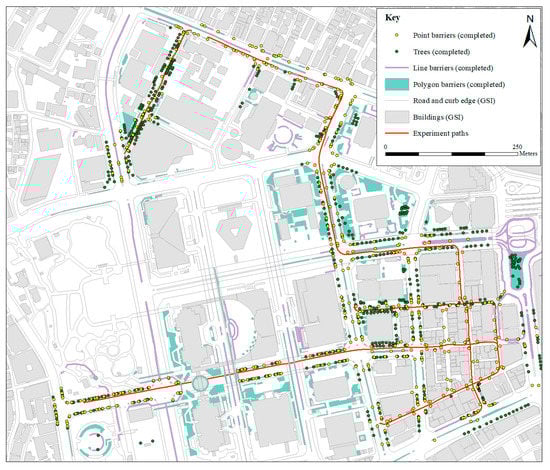 To mitigate any issues of inconsistency and incompleteness (as highlighted in Section 3.2), an additional set of ‘completed’ OSM layers was created. Supplementary data (aerial imagery and base map) from ATEC was used to support the manual digitization. By creating these ‘completed’ layers, it allowed the assessment of the capability of OSM, in a scenario where users had correctly and fully mapped all required features. This allowed for a more robust evaluation, without being hindered by data quality issues. In total, 196 polygon-barriers, 115 line-barriers, 596 point-barriers, and 537 natural points (trees) were manually added along the experiment path.