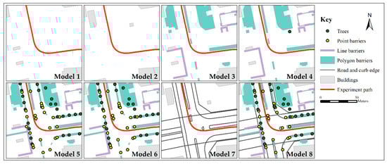 Eight models were evaluated, using different combinations of data from GSI, OSM, and manually digitized layers. Data for all five paths (I/II/III/IV/V) were used together. To begin, Model 1 only used the buildings layer directly from OSM. Similarly, Model 2 used just the building footprints from the GSI Japan topographic map. Model 3 adds the original unedited polygon, line and point barriers to the OSM buildings layer. The original unedited natural points (trees) layer from OSM was then added for Model 4. Model 5 then includes the manually ‘completed’ OSM barriers and natural points layers. Model 6 uses the same completed barriers and natural points layers as Model 5, but replaces the OSM building footprints with GSI data. Model 7 uses just GSI data: building footprints, and combined road and curb edge. Lastly, Model 8 considers the GSI data, with the addition of the completed OSM barriers and completed natural points layers.