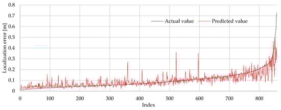Predicted (red) vs. actual (black) value of localization error, sorted by actual value (Model 8, test data).
