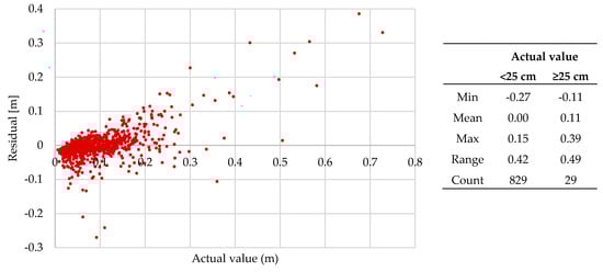 The following subsection presents a closer inspection into model 8. Note that the results in this subsection are using the hyperparameter tuned model 8. Figure 10 shows the predicted localization error in red, against the actual localization error in black. Note that at higher values of localization error (>20 cm), the model is underpredicting. Inspecting the residuals in Figure 11, this becomes much more apparent – for low values of localization error (0–25 cm), the model is performing relatively well, with a mean absolute error of around 0 cm. However, with higher values of localization error (>25 cm), the model can underpredict by up to 39 cm.