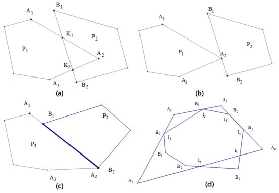 As shown in Figure 1a, the clipped polygon and the target polygon intersect. Intersection points and can be obtained through a collinearity equation. By judging the positive and negative values of the product of vector line segments, the intersection points can be judged to enter and exit. As illustrated in the same figure, , and thus, is the entry point relative to . Moreover, is the exit point. The resulting polygon is composed of a sequence of vertices that consist of , and . As illustrated in Figure 1b–d, the entry and exit points are unsuitable for describing intersection degradation.