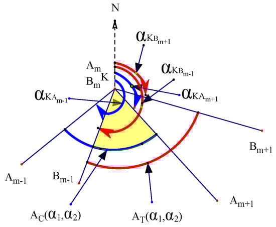 Figure 2 shows how to deal with the phenomenon of intersection degeneration. In Figure 2, the dotted arrow N points toward the north, which is the starting point of the azimuth calculation. Therefore, each line segment has its own azimuth. The clipped and target polygons have an intersection point K, which is also the location of vertices and . The azimuth intervals of the clipped and target polygons at intersection K are and . If and have overlapping parts (yellow in the figure), then both polygons overlap near the intersection point, which should be added to the vertex sequence of the resultant polygon.