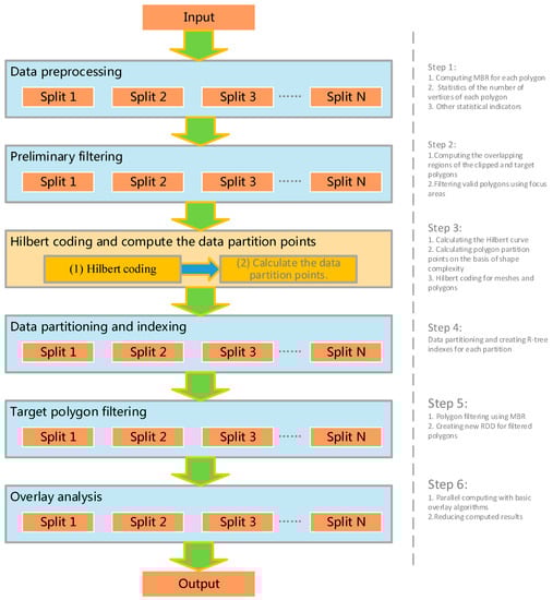 To ensure that the process is suitable for decoupling, we divide the distributed parallel overlay analysis process into six steps based on the characteristics of the algorithm: Data preprocessing, preliminary filtering, Hilbert coding, data partitioning and index building, data filtering, and overlay calculation (Figure 4).