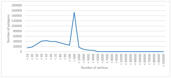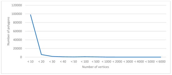 Through data checking, 88,000,000 vertices were found in 500,000 original terrain pattern data. Among all the polygons, the simplest polygon has four vertices, whereas the most complex polygon has 99,500 vertices. A total of 890,000 vertices were recorded in 110,000 slope patches. Among all slope patches, the simplest has 8 vertices, whereas the most complex has 5572 vertices. The statistics of the number of polygon vertices in the query and target layers are illustrated in Figure 6 and Figure 7, respectively.