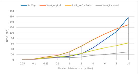 As shown in Figure 9, blue, red, yellow and grey represent the time consumed by ArcMap, Spark_original, Spark_NoComlexity and Spark_improved modes. With the increase in the data volume, the four time-consumption curves show an upward trend. The changes in these curves answer three questions related to the design of the experimental scenario.