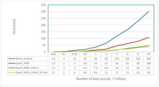 4.2.2. Compare the Performance Differences of Four Modes: Spark_original, Spark_MBR, Spark_MBR_Hilbert and Spark_MBR_Hilbert_R-tree