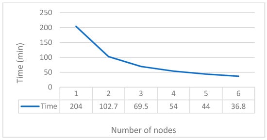 The experimental data are unified using 10 million polygons, and then one server is added at a time. As the number of servers increases, the time consumed in parallel computing decreases considerably (Figure 10). However, the trend of running time decreases as the number of nodes increases.