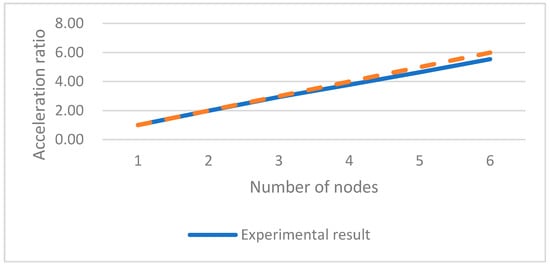 As shown in Figure 11, as the number of servers increases, the acceleration ratio decreases slightly but is nearly linear. In addition, Figure 12 illustrates that with the increase in the number of servers, the parallel efficiency gradually decreases, and finally stabilizes to more than 90%. This is a good result if we consider that the increase in the number of servers will increase the system synchronization and network overhead.