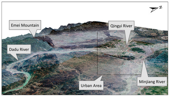 Leshan, a third-tier city in China, located in the southwest of the Sichuan basin and upper Yangtze River (103.3°–104.1°E, 29.0°–30.0°N). It is 120 km away from Chengdu (the capital city of the Sichuan province) and 270 km from Chongqing (one of four municipalities under the direct administration of the central government). It is an important part of the C-Y (Chengdu and Chongqing) urban agglomeration (Figure 2), and it lies in the southwest mountain region in the Sichuan Basin. The southwest topography is higher than that of the northeast (Figure 3). Furthermore, it is a famous ecotourism city with pleasant weather and numerous historical heritage sites. By the end of 2018, LS had four districts, seven counties, and one county-level city with a total coverage of 847 km2; its population was 1 million. The central district lies at the confluence of the Minjiang River, Dadu River, and Qingyi River. In LS, the terrain is dominated by low mountains, with dense river networks, and limited available land resources. Currently, with the rapid economic development and urban expansion in this area, conflict between constructed land and other landscape types has occurred, causing ecological imbalance.