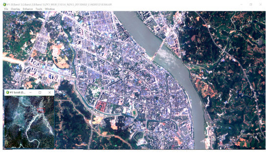We obtained the land use and land cover (LULC) dataset (1:100,000, 2011) of Sichuan from the Cold and Arid Regions Science Data Center (CASDC). Resource No.3 (ZY03) satellite remote sensing image (July 2018) was downloaded from the China Centre for Resources Satellite Data and Applications (CCRSDA). The image was taken with a multi-spectral camera mounted on the ZY03 satellite. It has four spectral bands with a wavelength range of 0.45–0.89 μm, a spatial resolution of 5.8 m, and a width of 51 km (see Figure 4). Digital elevation data (resolution of 30 m) were from the United States Geological Survey (USGS); statistical data of the urban population and GDP (1995–2018) were provided by the LS bureau of statistics (LSBS). The urban planning and land use thematic maps were provided by the LS land and resources bureau; geological hazards and subgrade bearing capacity data were provided by Sichuan province’s No.207 geological survey team.