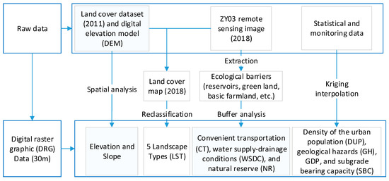 The method of data preprocessing was as follows (see Figure 5). (1) We used the resources satellite No.3 image to update the LULC dataset (2011). Then, we merged the subtypes into more general types; for example, sparse woods were merged into woods. We thus achieved five types of land use and land cover for LS. The five area types were woodland, grassland, farmland, water body, and constructed land. We extracted reservoirs, rivers, roads, built-up areas, pits, and greenbelts from the remote sensing image (ZY03). Vector data were converted to digital raster graphic (DRG) using buffer analysis, e.g., convenient transportation (CT) and the water supply-drainage conditions (WSDC). (3) Statistical and monitoring data, including the density of the urban population (DUP), geological hazards (GH), gross domestic product (GDP), and subgrade bearing capacity (SBC), were interpolated into DRG by the Kriging interpolation [30] method. In view of the size of the study area and the spatial resolution of the raw data (DEM), the output raster resolution was set at 30 m in the buffer analysis and Kriging interpolation. In addition, all of the DRGs were projected into the Universal Transverse Mercator (UTM) projection and World Geodetic System (WGS) 1984 reference system and clipped with an urban bounder. The data preprocessing flow is shown in Figure 5.