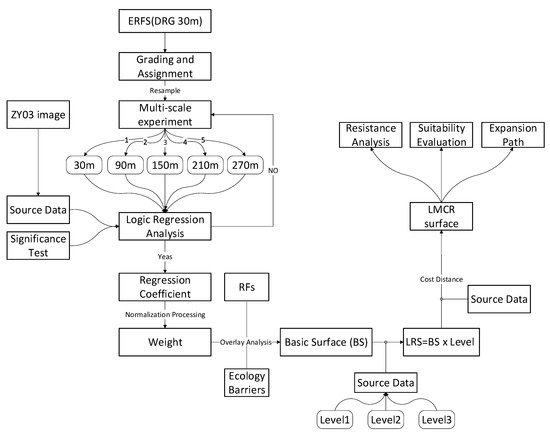 Some researchers have applied the MCR model to study the process of urbanization [21,22,23,24]. Through the analysis of previous research, we found that the model was not perfect and some limitations needed to be improved, especially for the UE of mountain cities. First, the weights allocation of resistance factors was still being conducted by expert scoring. Second, the problem of homogenization of the expansion source was not solved. Viewed from this perspective, the MCR model is inaccurate when evaluating urban expansion in mountain cities. Accordingly, we improved this model and used it to evaluate the urban expansion of LS. The specific flow chart of the improved LMCR model is shown in Figure 6.