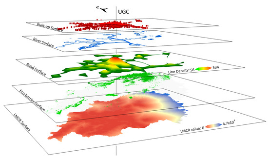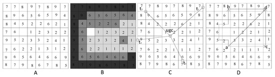 The digital grid consists of the basic cell representing the LMCR value, and the cell with no data denotes the ecological barrier. The four digital grids (A, B, C, and D) represent the LMCR surface, suitability zone, the resistance variation in different directions and the calculation of expansion paths, respectively. Moreover, the urban geographic center (UGC) denotes the urban geographic center and indicates the satellite town.