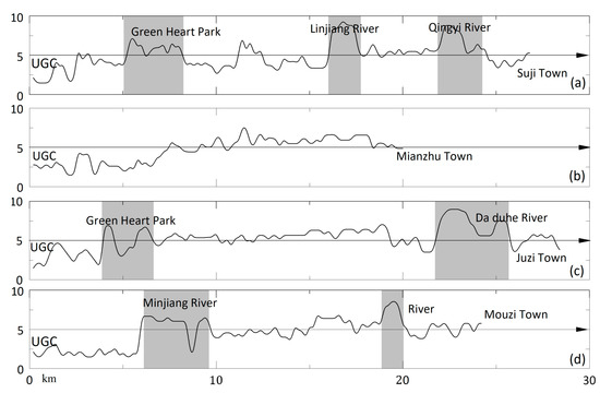 Some important satellite towns (e.g., Suji, Mianzhu, Juzi and Mouzi) and villages surround the central district of LS and constitute its urban–rural gradient structure [31,32,33]; the connectivity of these towns has increased gradually with the increases in economic exchanges. However, we found that the expansion resistance was significantly different from the central district to each satellite town based on the LMCR surface. This indicated the differences in conflicts and competitions between the constructed land and other landscape units in the various expansion directions. Particularly, the resistance increased dramatically when UE crossed the rivers or hills in the expansion direction. A resistance trend analysis was performed from the UGC to satellite towns, and the results are shown in Figure 8. Although the satellite towns had the same level of development (e.g., GDP and DUP), the variation trends of resistance were different. From UGC to Suji, the expansion process bypassed the Green Heart Park and crossed two rivers (important resistance factors) and led to an increase in the resistance (Figure 8a). The distance from Mianzhu to UGC was 20 km, and the average resistance value in the Mianzhu direction was lower than the resistance value of the Suji direction; this is because no rivers or hills were crossed during the expansion process. Moreover, the central district and Mianzhu are connected by 305 provincial roads and many villages distributed along the roads. This also promoted urban expansion. In the southward expansion to Juzi (LS high-tech zone), apart from bypassing Green Heart Park and crossing the Dadu River, UE overcame less resistance. In addition, this area had a flat terrain and developed industry. Figure 8c shows that the resistance increased only when bypassing Green Heart Park and crossing Dadu River. Northward to Mouzi, the dense urban population and flat terrain provided indispensable conditions for urban expansion, accordingly, the resistance curve was generally smoother than in the other regions (Figure 8d). Finally, Mouzi had convenient transportation, such as the beltway and the highway connecting it to Guanmiao.